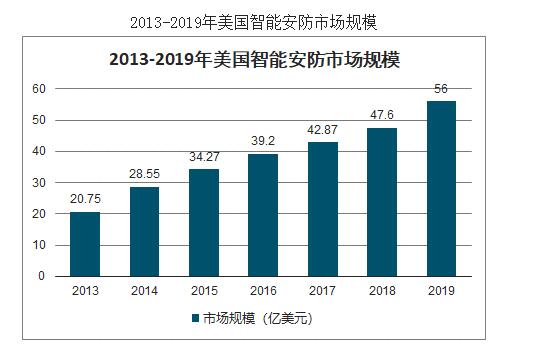 2018年,美國安防行業(yè)收入達到952億美元,而美國智能安防的市場滲透率約為5%。2018年美國智能安防行業(yè)規(guī)模為47.6億美元。2013-2018年美國智能安防行業(yè)規(guī)模年復(fù)合增長率達到18%, 2019年美國智能安防行業(yè)市場規(guī)模約為56億美元。
