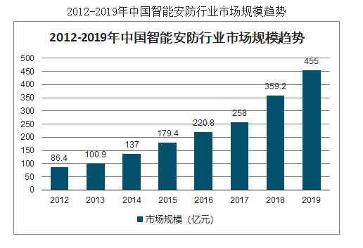 2018年我國安防行業(yè)總產(chǎn)值為7183億元,目前我國智能安防滲透率約為5%, 2018年我國智能安防市場規(guī)模為359.2億元。2012-2018年市場規(guī)模年復(fù)合增長率高達26.8%,2019年我國智能安防市場規(guī)模約為455億元。