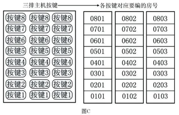 第六章中的6.3段已經(jīng)介紹了房號(hào)設(shè)置的方法,也就是數(shù)碼式主機(jī)的房號(hào)設(shè)置方法,那么直按式的主機(jī)房號(hào)應(yīng)該怎么編呢?下面來介紹下直按式主機(jī)每個(gè)按鍵所對(duì)應(yīng)的房號(hào)。