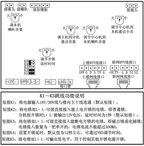 2)由于受施工場所、環境、線材的不同,主機或分機可能會出現嘯叫聲。如果出現此類情況,安裝工作人員可以調整電位器,調整方法:逆時針旋轉半圈至一圈慢慢調小,直至嘯叫聲消失,主機和分機都能聽到最大最清晰最洪亮的對話即調試完畢。
