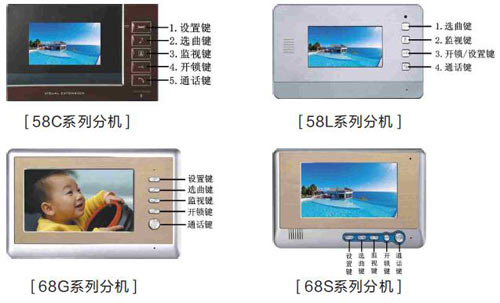 在待機狀態下按兩下“設置”鍵,分機進入色度設置界面,分機顯示當前的色度參數,按“開鎖”鍵,降低亮度,按“監視”鍵提高色度;