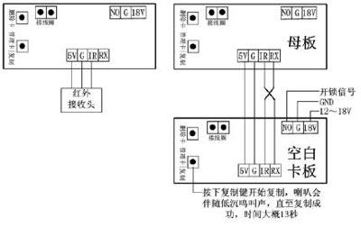 5、數據復制:一條4P對4P的線把2個刷卡板連接在起來,如下圖所示。在空白板刷卡板上供電,供電后按一下空白刷卡板上的復制按鍵,聽到喇叭響約13秒后停止,數據即復制成功,這時2個刷卡板的卡數據相同。在多門口要求卡相同可以快速復制而不用每臺主機都用管理卡增加;
