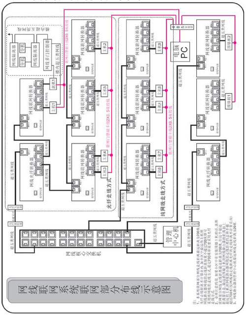 1、本系統聯網部分網線走線距離最遠距離為700米。光纖走線距離不計算在內,如小區中最遠的主機到網線路由器網線的走線距離如果不超過700米即可采用純網線的走線方式,超過700米即需要采用光纖走線方式。